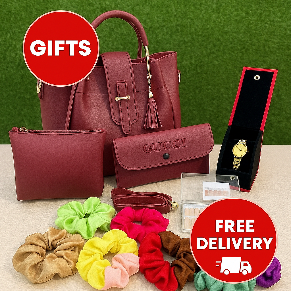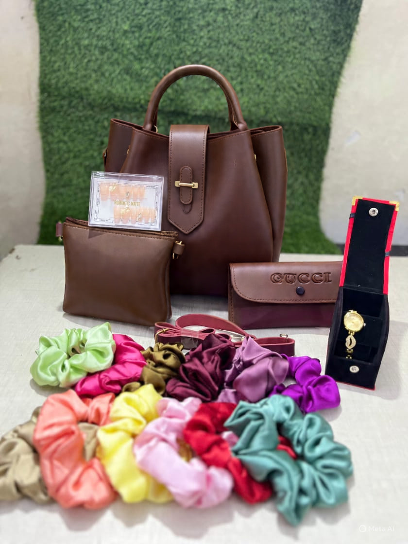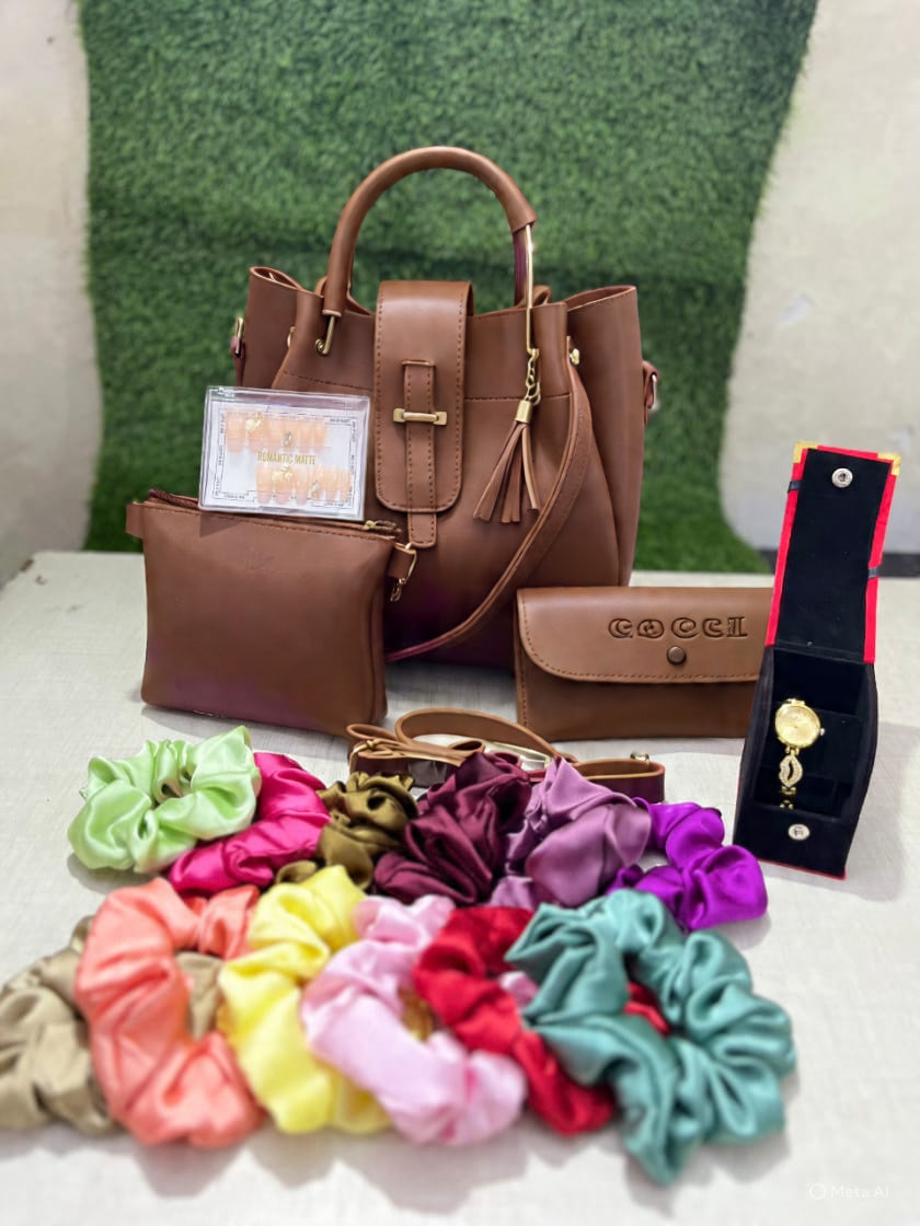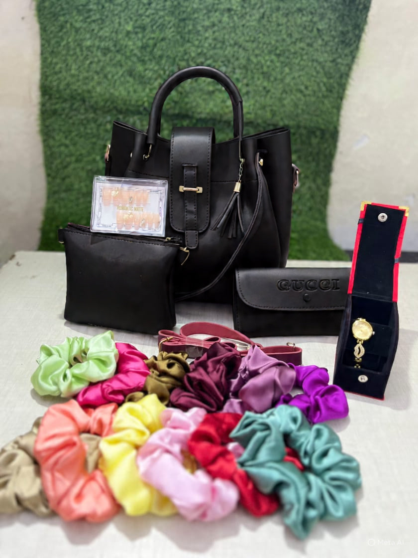 Luxury Bag Combo Stylish Bag Set with 12 Scrunchies, 12 Fake Nails & Elegant Watch β Perfect Gift Combo