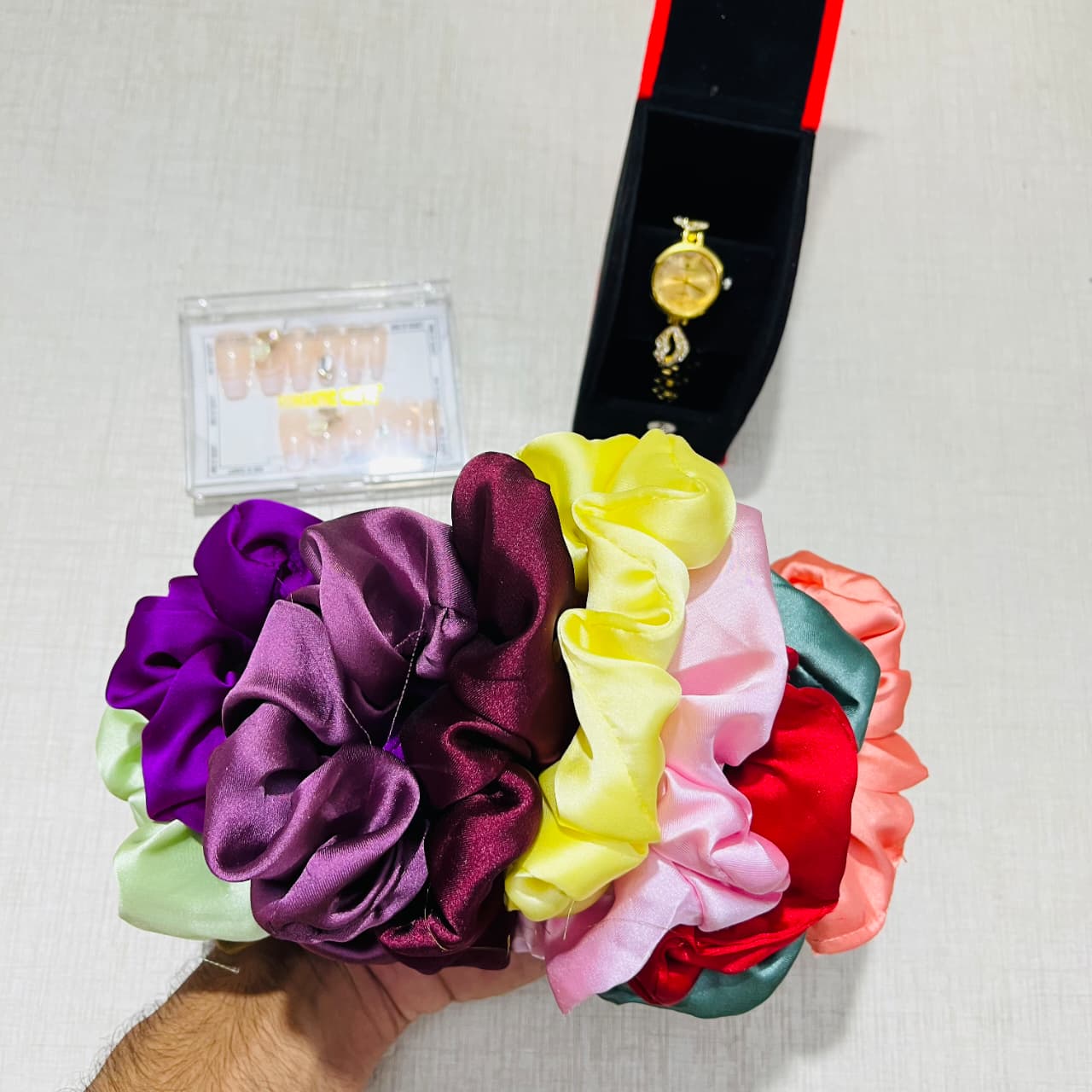 3-in-1 Stylish Bag Set with 12 Scrunchies, 12 Fake Nails & Elegant Watch β Perfect Gift Combo